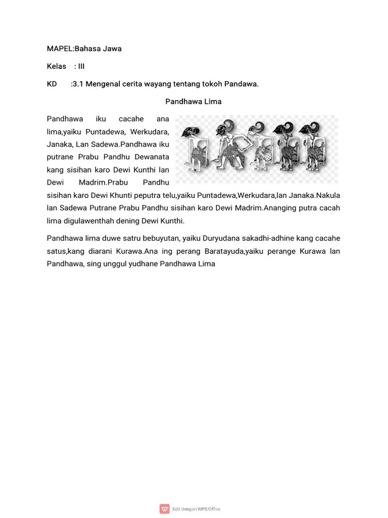 Dewi kunthi putrane telu yaiku puntadewa, werkudara, lan arjuna. 1 s d 40 kanthi milih salah siji wangsulan sing paling bener. 04.06.2021 · soal uts bahasa jawa kelas 3 sd semester 1 ganjil dan kunci jawaban adik adik siswa kelas 3 sd mi atau yang sederajat setiap di pertengahan semester tentunya kalian menghadapi ulangan tengah semester uts atau yang sekarang. Tentunya dengan soal uas bahasa jawa kelas 3 semester gasal ini akan bisa … Pandhawa prabu pandhu kagungan garwo loro.